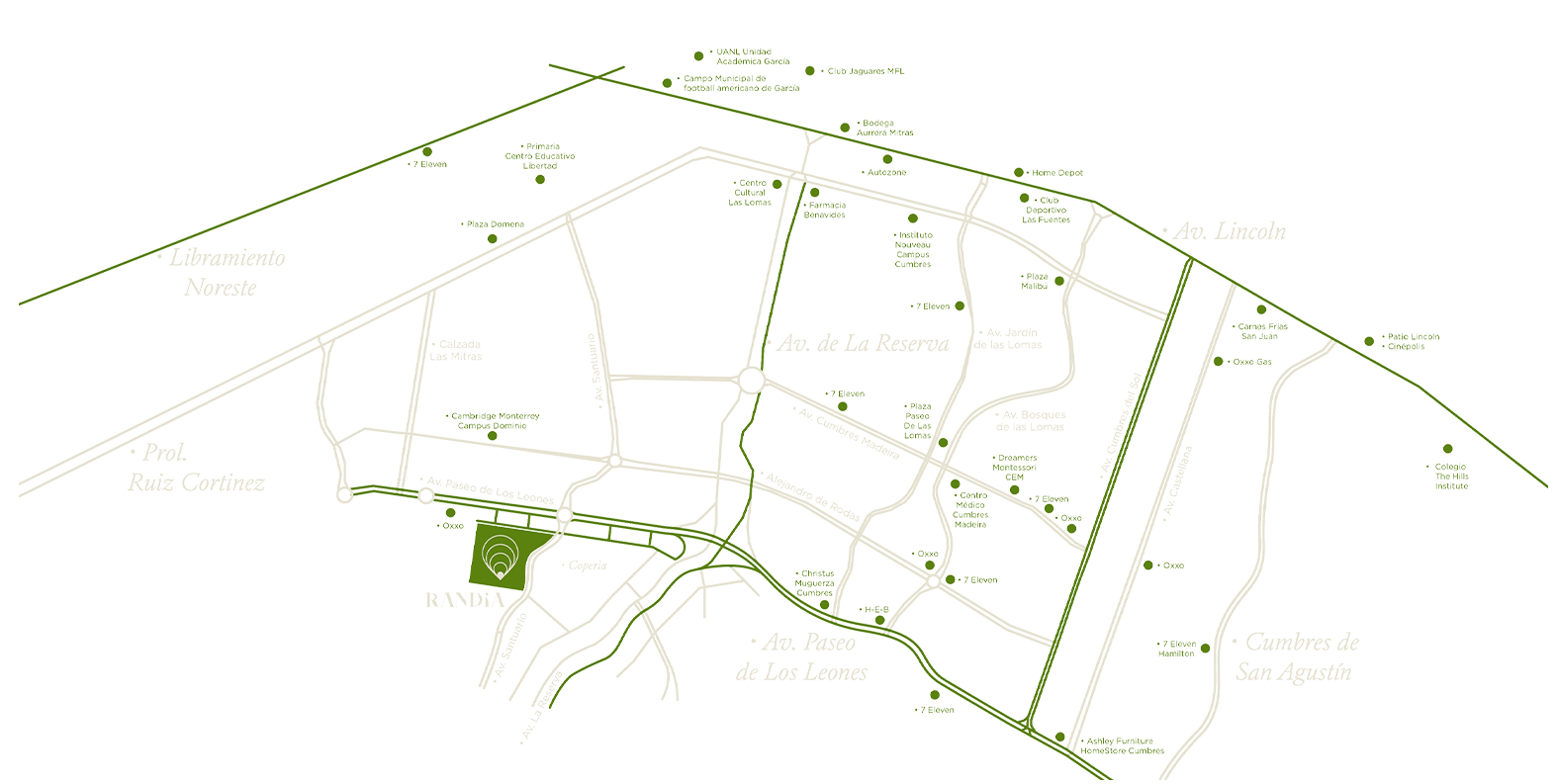 Hospitales, Universidades, Escuelas, Gasolineras, Comercios